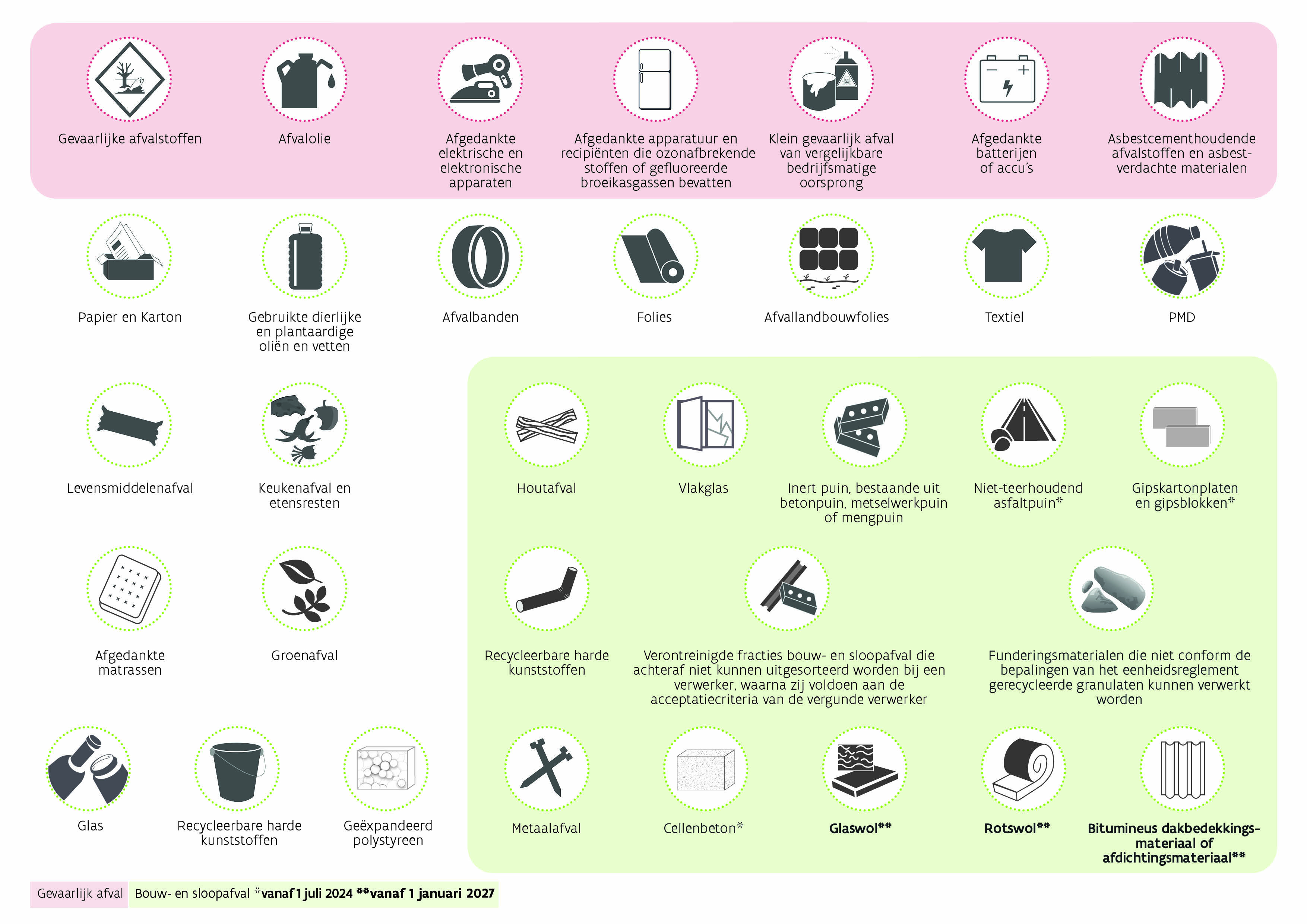 Vlarema geeft een lijst van bedrijfsafvalstoffen die u apart moet houden voor ophaling of inzameling (visuele voorstelling van artikel 4.3.2). Volgende afbeelding geeft een overzicht van afvalstoffen die op een werf voorkomen en die gescheiden moeten worden aan de bron.Gevaarlijke afvalstoffen moeten we weren uit de materiaalkringloop. Deze moeten daarom steeds afzonderlijk worden ingezameld. Voor volgende afvalstoffen geldt een nultolerantie met weigeringsplicht wanneer deze niet gescheiden ingezameld worden aan de bron: