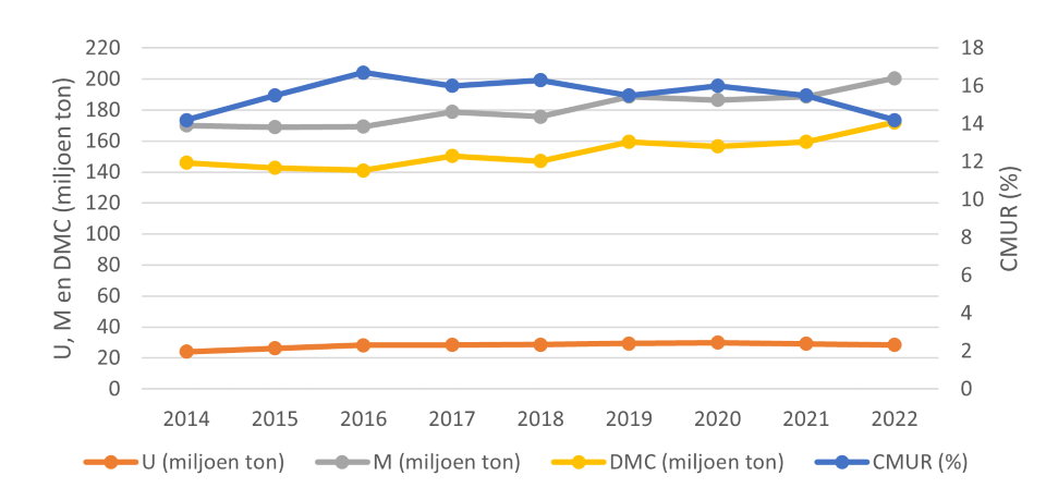 Het circulair materiaalgebruik (U) is de som van de RCV_R en de uitvoer van afval, min de invoer van afval. Het circulair materiaalgebruik stijgt tussen 2014 en 2020 van 21,4 miljoen ton naar 29,9 miljoen ton. In 2021 daalt U naar 29,2 miljoen ton en verder tot 28,4 miljoen ton in 2022. Deze dalingen in 2021 en 2022 zijn het gevolg van een daling in de RCV_R en een daling in de uitvoer van afval. Hoewel de invoer van afval ook daalt en deze van de U wordt afgetrokken, is deze daling niet voldoende om U te doen stijgen.