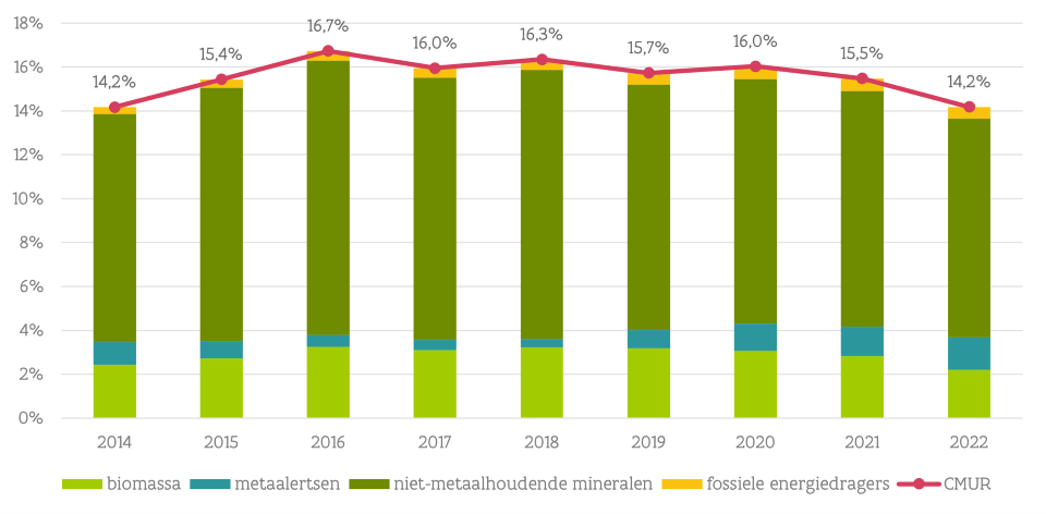 De hoogste CMUR is in Nederland, tussen 25,6% en 29%. Opvallend is dat de CMUR van België hoger ligt dan deze van Vlaanderen, tussen 17,9% en 22,9%. De CMUR van België stijgt tussen 2014 en 2020 en daalt daarna. Voor Vlaanderen zijn er meer schommelingen tussen 2014 en 2020, maar in het algemeen is de CMUR in Vlaanderen ook gestegen tussen 2014 en 2020 en daarna ook gedaald in 2021 en 2022. De lagere CMUR in Vlaanderen kan deels verklaard worden door de hogere DMC, die in 2022 in België 165,9 miljoen ton bedraagt en in Vlaanderen 172,1 miljoen ton (Eurostat). De hogere DMC van Vlaanderen wordt veroorzaakt door het ‘poorteffect’ (in- en uitvoer van materialen in België gaat grotendeels via Vlaanderen) en doordat in Vlaanderen het aandeel interregionale invoer vanuit de andere gewesten groot is.