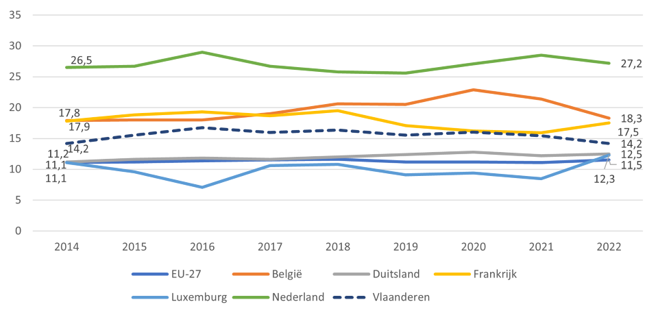 Onderstaande figuur vergelijkt de Vlaamse CMUR met de CMUR van de EU, België, en enkele buurlanden. We zien dat de CMUR van de EU heel wat lager ligt dan deze van België en de buurlanden, met Luxemburg als uitzondering. De CMUR van de EU schommelt tussen 11,1% en 11,6% tussen 2014 en 2022, die van Luxemburg ligt tussen 7,1% en 12,3% tussen 2014 en 2022. De CMUR van de EU schommelt minder dan deze van de lidstaten.
