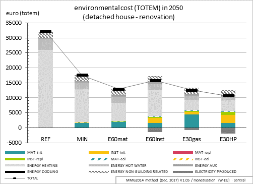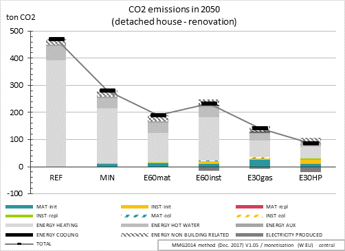 In opdracht van de OVAM evalueerde het Wetenschappelijk en Technisch Centrum voor het Bouwbedrijf (WTCB) verschillende renovatie- en nieuwbouwscenario’s voor een referentieperiode van dertig jaar. De scenario’s variëren in E-peil, isolatie, materiaalkeuzes, installaties (ventilatie, warm water, zonnepanelen …) enzovoort. De emissies CO2-eq werden vergeleken met de totale milieu-impact. De totale milieu-impact is de som van de impact op alle indicatoren (inclusief broeikasgasemissies), in alle stappen van de kringloop.