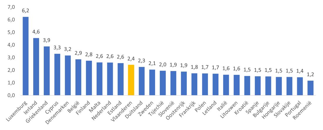 In vergelijking met EU-27 landen is de Vlaamse consumptievoetafdruk eerder aan de hoge kant (zie Figuur 2). Het EU-27 gemiddelde bedroeg in 2019 1,96 punten per capita.