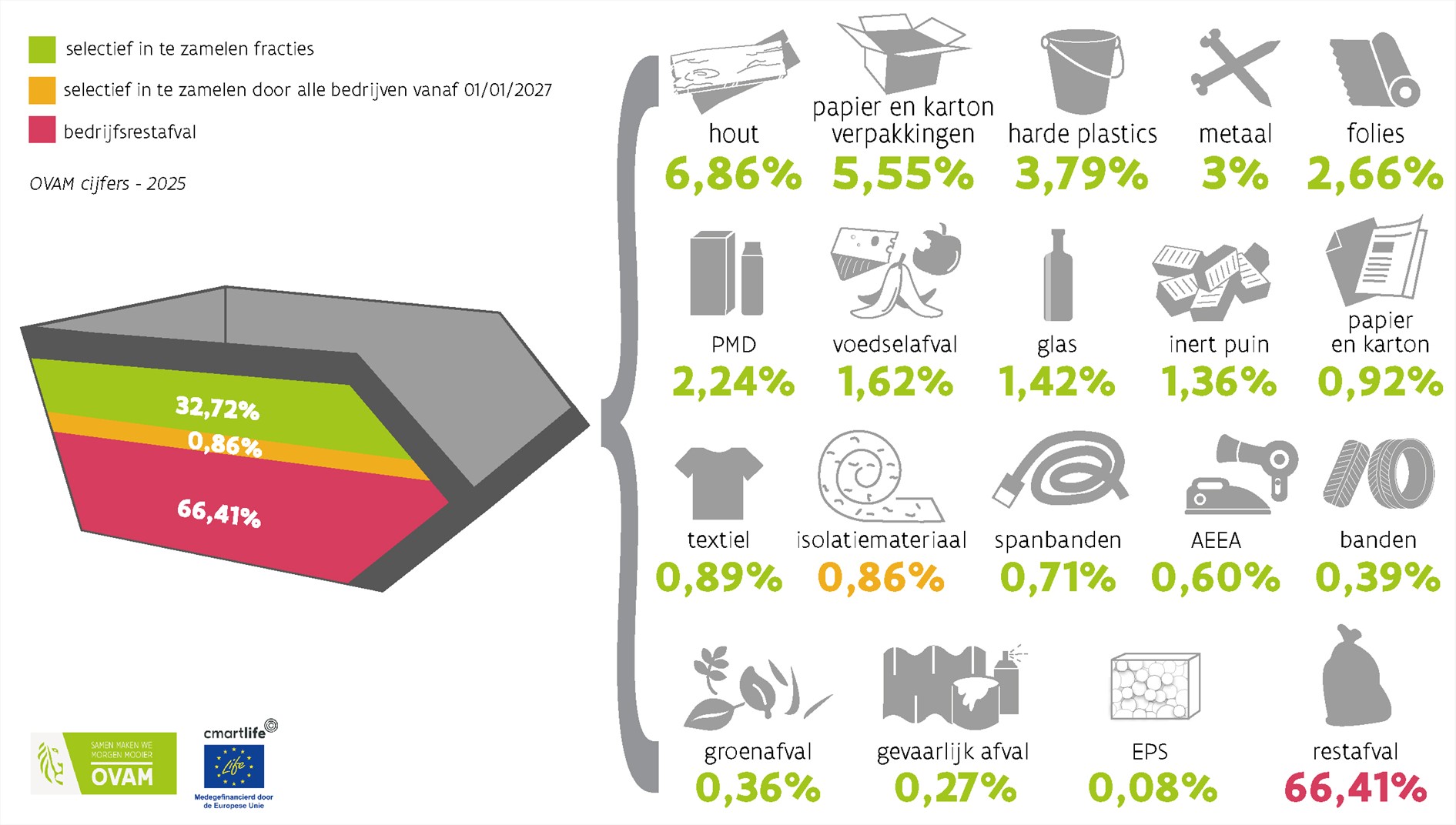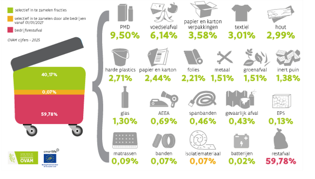 In het kader van het uitvoeringsplan werd in 2025 opnieuw een sorteeranalyse op bedrijfsrestafval uitgevoerd. Deze studie bouwt verder op de studies van 2017 en 2021-2022, met oog op vergelijken van de resultaten voor de niet-sectorgebonden steekproeven en de sectorgebonden steekproeven die werden geïntroduceerd in 2021-2022. De methodiek van de sorteeranalyse van 2021-2022 wordt zo veel als mogelijk gevolgd om dit te realiseren. De resultaten kan u lezen in dit eindrapport.