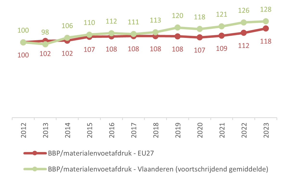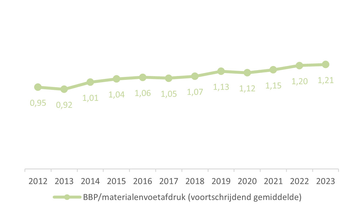In de periode 2012-2023 zien we een absolute ontkoppeling tussen de economie en de materialenvoetafdruk. Het voortschrijdend gemiddelde van de materialenvoetafdruk daalt (-4 %) terwijl het bbp toeneemt (+22 %). Om dezelfde output te produceren zijn er minder directe én indirecte grondstoffen nodig. Hierdoor stijgt de verhouding tussen het bbp en de materialenvoetafdruk.