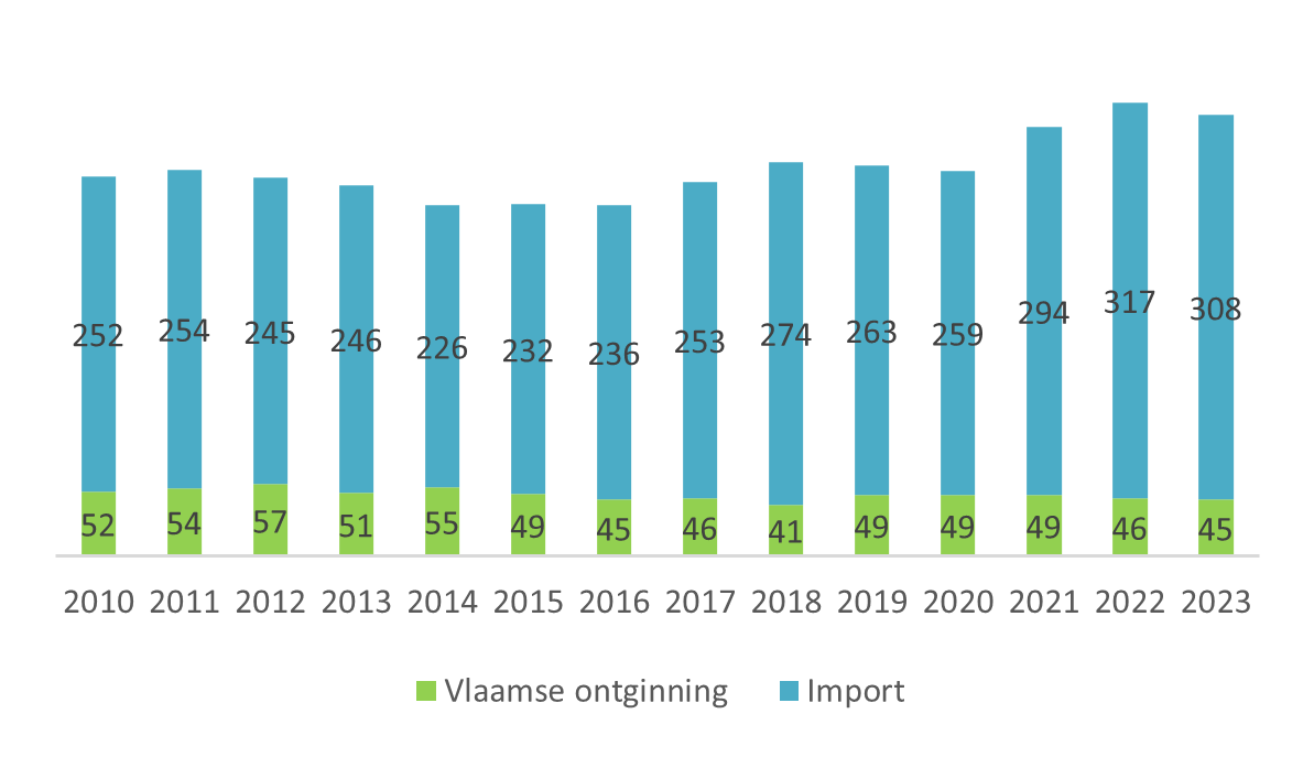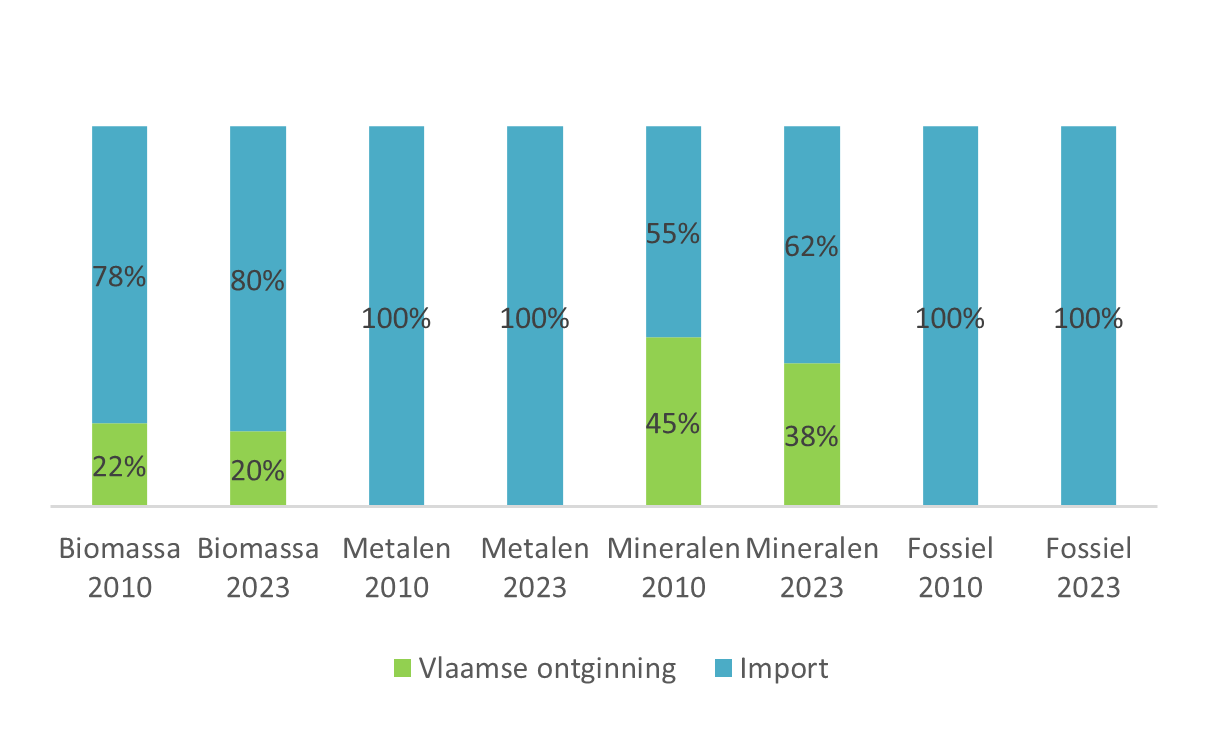 De verhouding tussen Vlaamse ontginning en import illustreert hoe afhankelijk we zijn van de import van grondstoffen, halffabricaten en afgewerkte producten om onze economie te doen draaien. De stijging van de import van materialen in de periode 2010-2023 (+22 %) was groter dan de daling van de Vlaamse ontginning (-13 %). Vlaanderen verwerkt dus meer materialen én is meer afhankelijk geworden van het buitenland wat betreft materialen, zowel voor biomassa als voor niet-metaalhoudende mineralen.