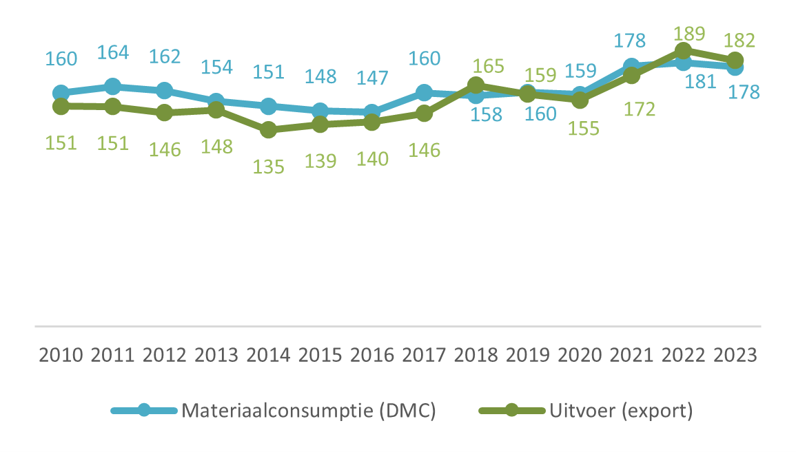 Na een stijging in 2011, daalt de Vlaamse materiaalconsumptie tot 2016. Vanaf 2017 kent de Vlaamse materiaalconsumptie een stijgende trend, evenwel met jaar op jaar dalingen in het jaar 2018, 2020 en 2023. In 2021 zien we een sterke stijging van de DMC die verklaard kan worden door enerzijds het herstel na corona en anderzijds door de rol van de haven van Zeebrugge als centrum voor aardgasimport [1]. In de periode 2010-2023 is de Vlaamse materiaalconsumptie met 11 % gestegen. De uitvoer van materialen is ook gestegen in de periode 2010-2023 (+21 %).