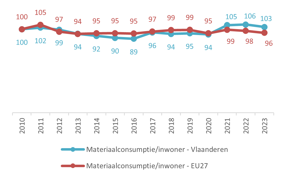 De Vlaamse materiaalconsumptie per inwoner kent een gelijkaardige evolutie in de periode 2010-2023: deze indicator daalt van 25,6 ton per inwoner in 2010 naar 22,7 ton per inwoner in 2016. Vanaf 2017 is de trend eerder stijgend tot opnieuw 26,2 ton per inwoner in 2023. De materiaalconsumptie per inwoner in de EU-27 kent eveneens een dalende trend tot 2016, maar vanaf 2017 blijft de trend eerder stabiel. We vergelijken hier enkel de trends en niet de werkelijke waarden. Vergelijking met andere regio's en landen vereist de nodige voorzichtigheid. Verschillende factoren spelen een rol: grootte en productiviteit van een economie, inwonersaantal en -dichtheid, consumptiepatronen, klimaat, de samenstelling (type activiteiten) van een economie, de beschikbaarheid van grondstoffen of alternatieve grondstoffen en de beschikbare technologieën.