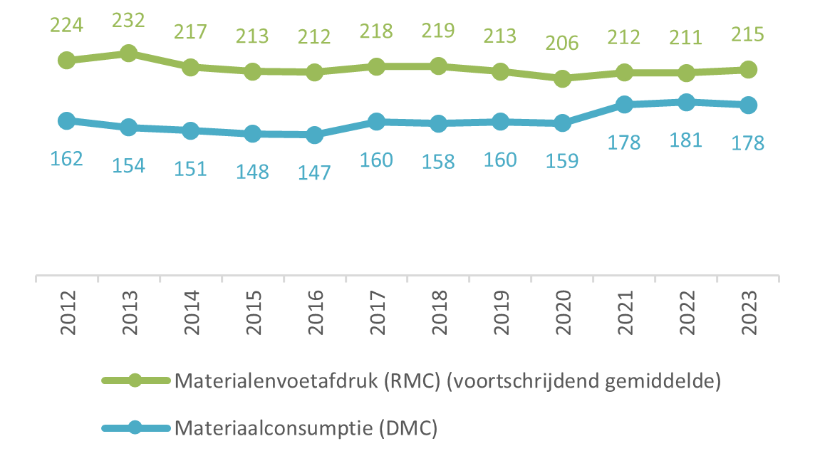 Het voortschrijdend gemiddelde van de Vlaamse materialenvoetafdruk daalde tussen 2012 en 2016 van 224 miljoen ton naar 212 miljoen ton. Na een stijging in 2017 en 2018 kent het voortschrijdend gemiddelde een dip in 2020 van 206 miljoen ton. Vanaf 2021 stijgt het voortschrijdend gemiddelde van de materialenvoetafdruk naar 215 miljoen ton in 2023. Over de periode 2012-2023 is het voortschrijdend gemiddelde van de materialenvoetafdruk met 4 % gedaald.