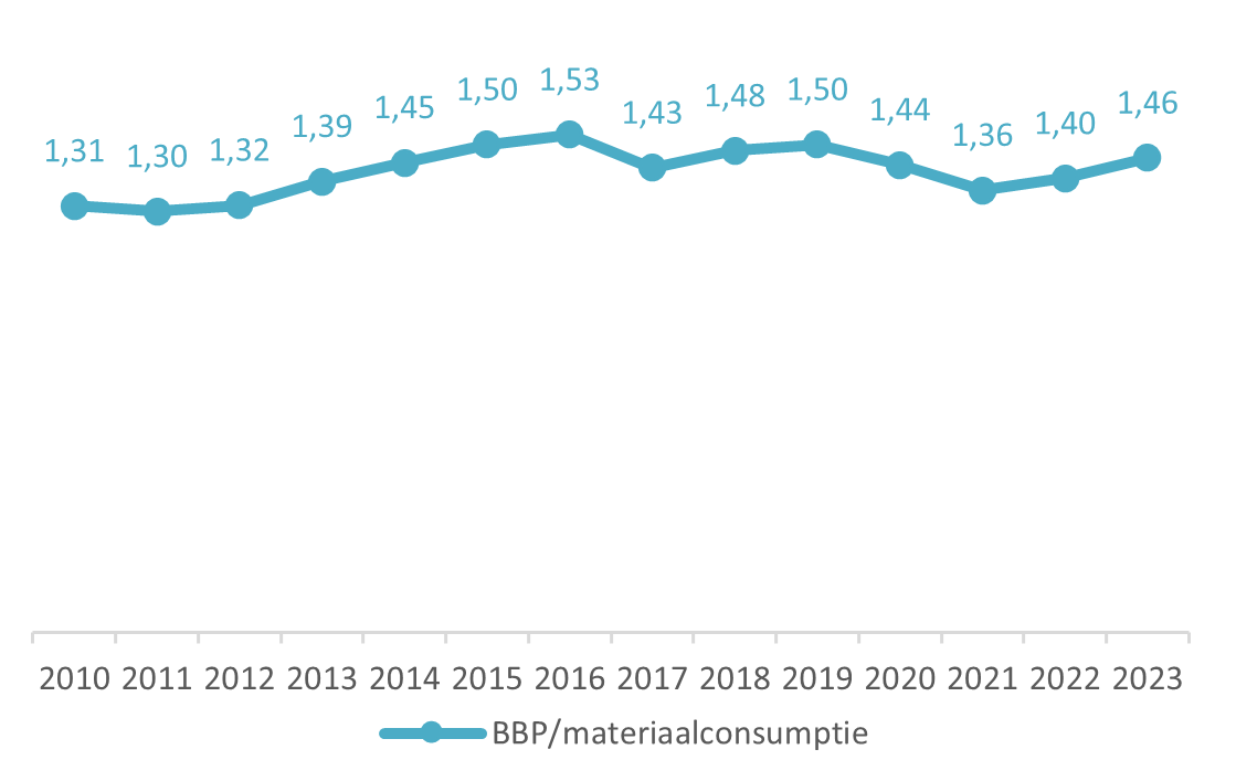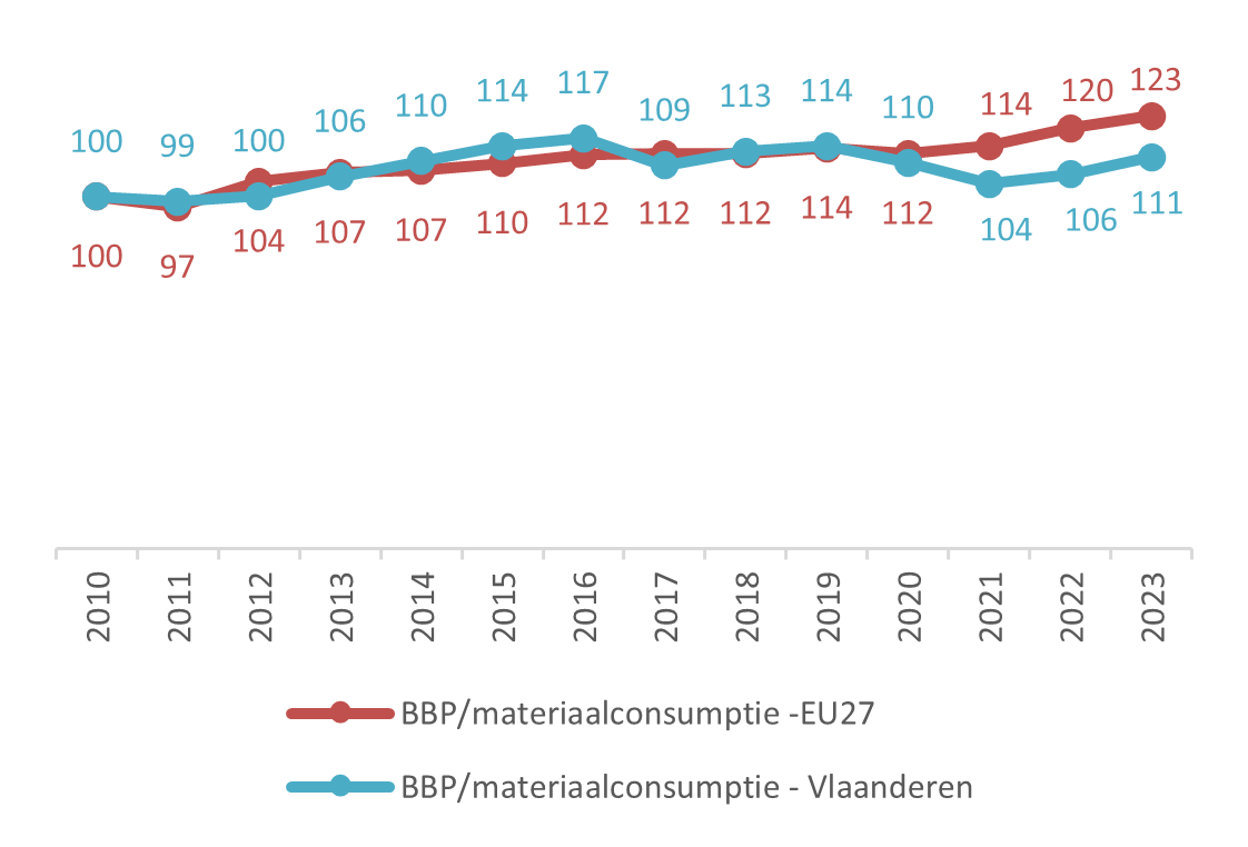 De Vlaamse economie als geheel ontkoppelt zich op relatieve wijze van de materiaalconsumptie in de periode 2010-2023. De Vlaamse economie groeit in deze periode (+24 %), terwijl de materiaalconsumptie minder snel toeneemt (+11 %). In de trend van deze productiviteitsindicator zien we een stijging tot 2016 gevolgd door een daling tot 2021. In 2022 en 2023 stijgt de productiviteit opnieuw.