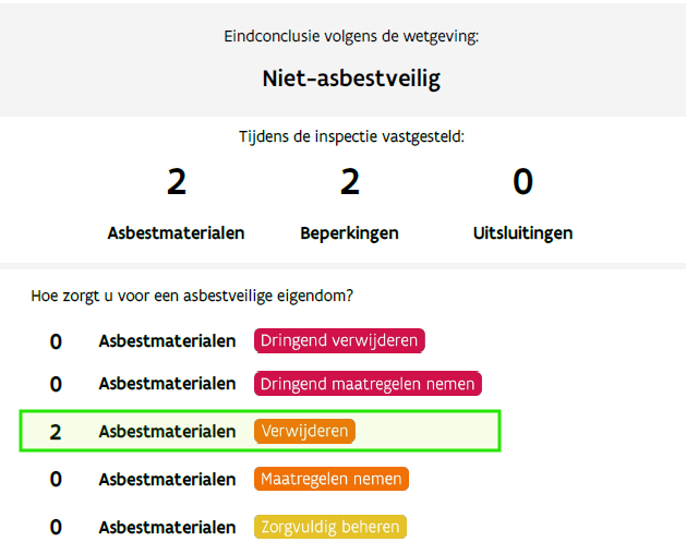 - Als beide materialen verwijderd zijn, dan wordt de eindconclusie ‘asbestveilig’. Een aanpassing van uw asbestattest is dan nodig.